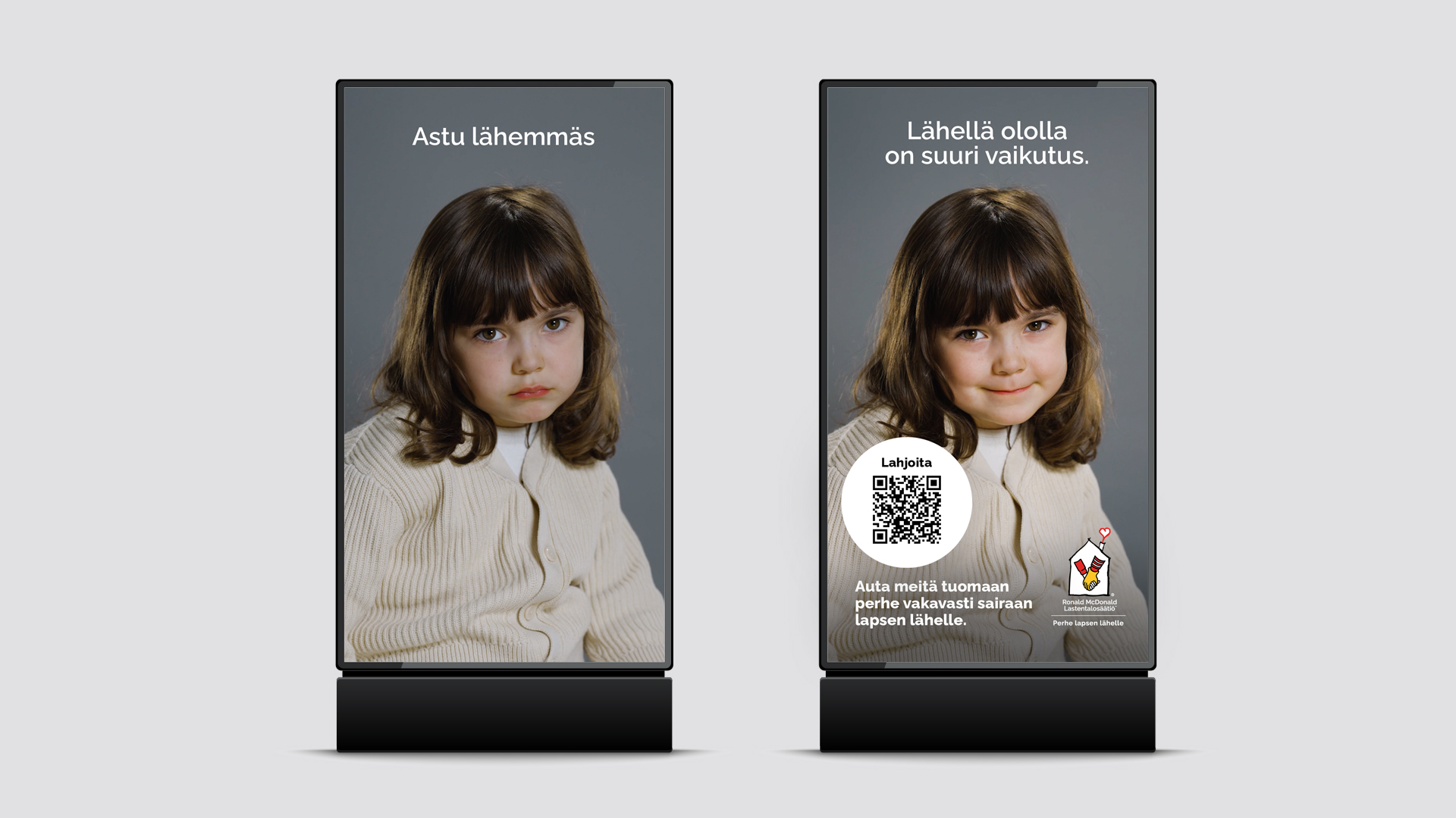 Valjastimme käyttöön ulkomainospintoja Triplan ja Kampin vilkkaissa kauppakeskuksissa. Pinnoissa näkyy lapsi, joka on pelosta itkuinen ja surullinen ollessaan yksin. Kun ihminen käveli näytön lähelle, alkoi lapsi saada lohtua ja piristyä. Ihmisen tullessa näytön lähelle, nousi lapsen kasvoille jo helpottunut hymy. Lapsen ilmeen kirkastuttua näytölle ilmestyi viesti, joka kehotti lahjoittamaan Ronald McDonald Lastentalosäätiölle.